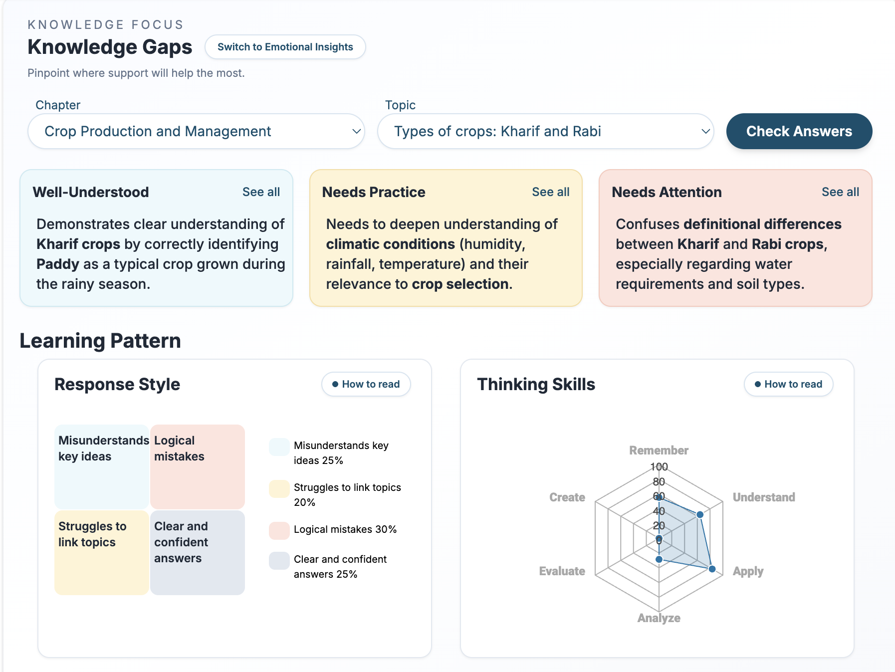 | Level of Student Understanding | Shows whether students are primarily at Remember, Understand, or Apply stages2 Bloom-level indicators reflect structured question performance patterns and are designed to support teaching decisions. | Marks show correct or incorrect answers. |