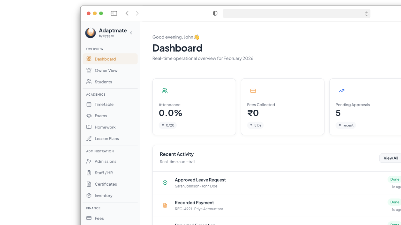 Diagnose learning gaps, generate AI lesson plans, personalize homework, track student well-being, manage fees and attendance, automate compliance, and monitor school-wide performance — all in one connected learning intelligence system.
