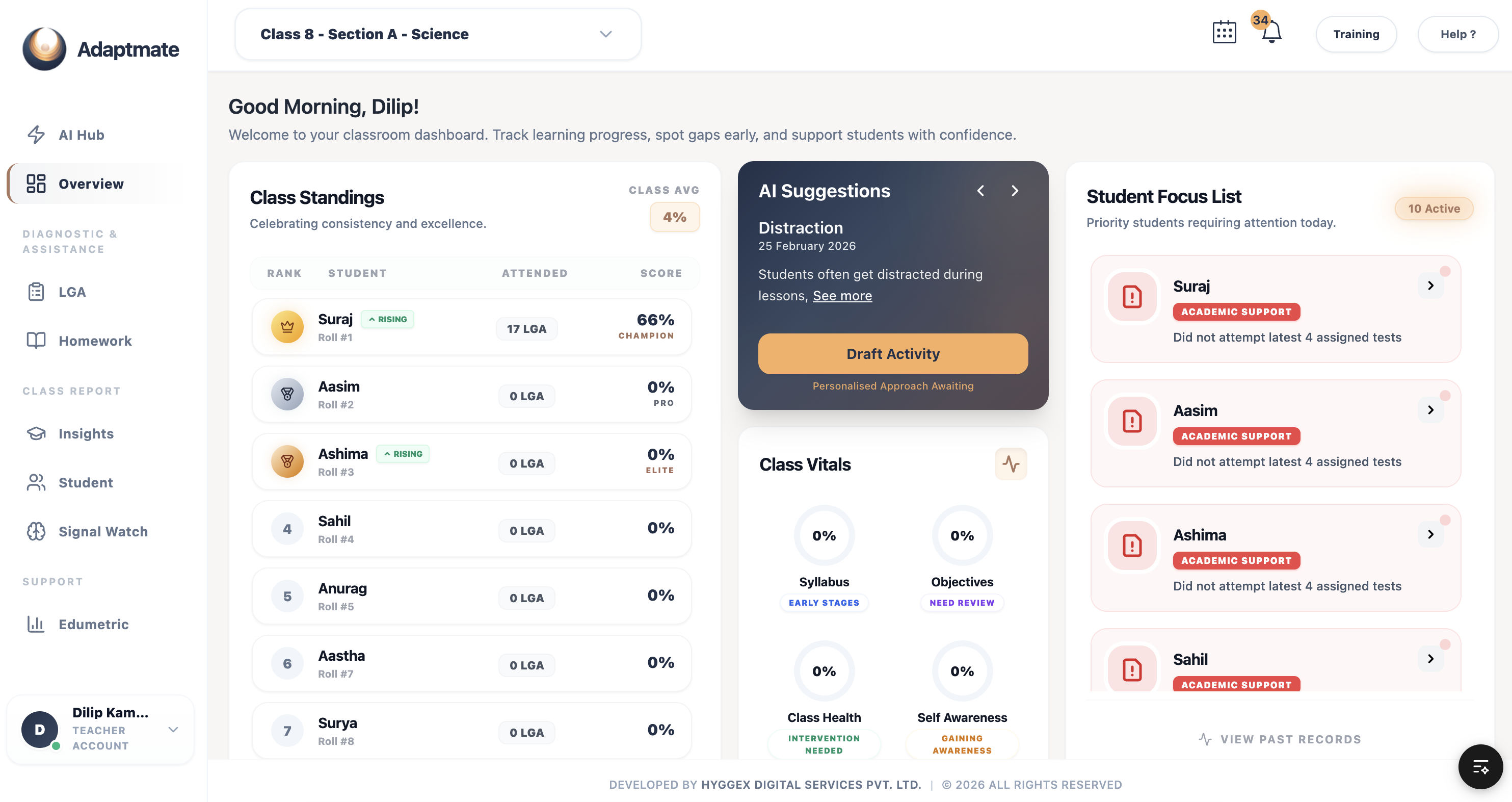 What stood out to me is the ability to track the learning health of all classes in one place. Manual reporting used to take considerable time, but with Adaptmate, much of that is automated. It brings clarity and structure to academic monitoring.